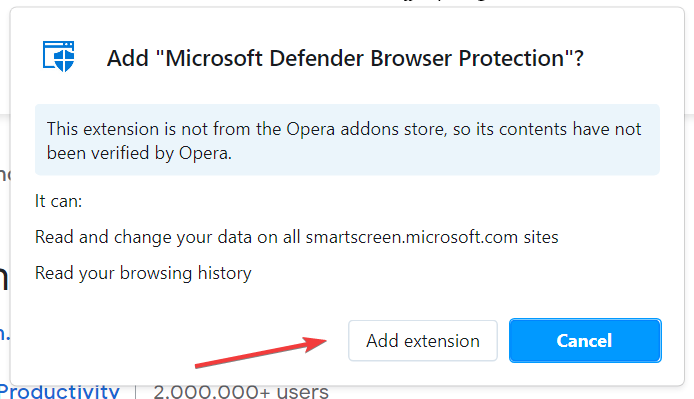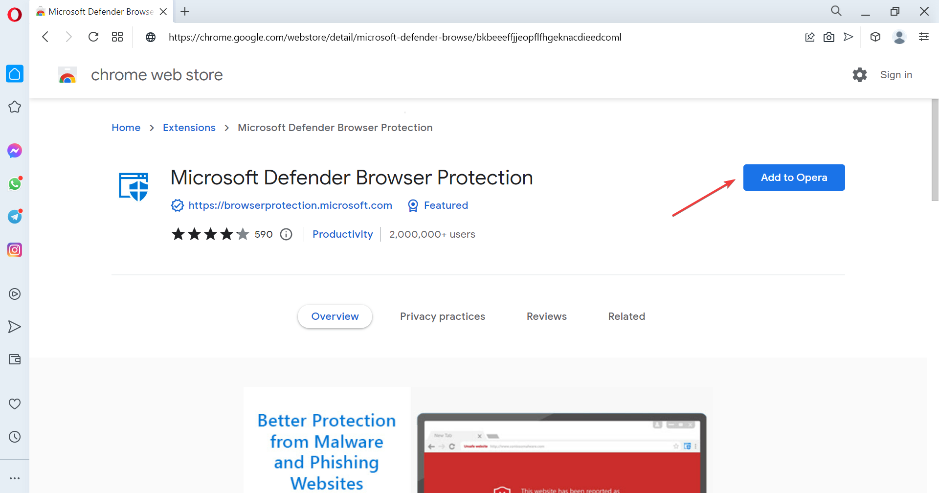 - Visit the Windows Defender Browser Protection’s Chrome Web Store page on Opera One, and then click the Add to Opera button.