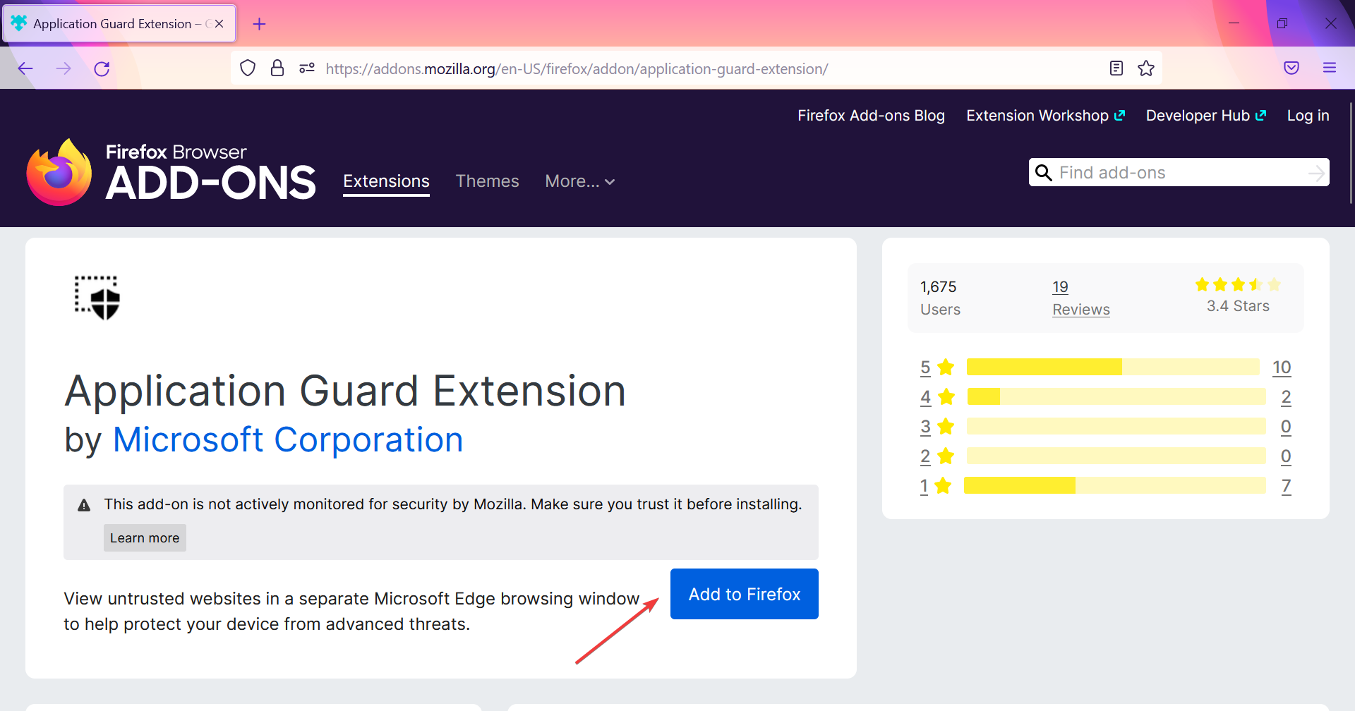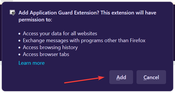 - Open the Application Guard Extension on the browser, and then click on the Add to Firefox button.