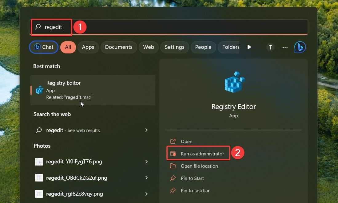 - Press the Windows key to launch the Start menu, type regedit and select Run as Administrator.
