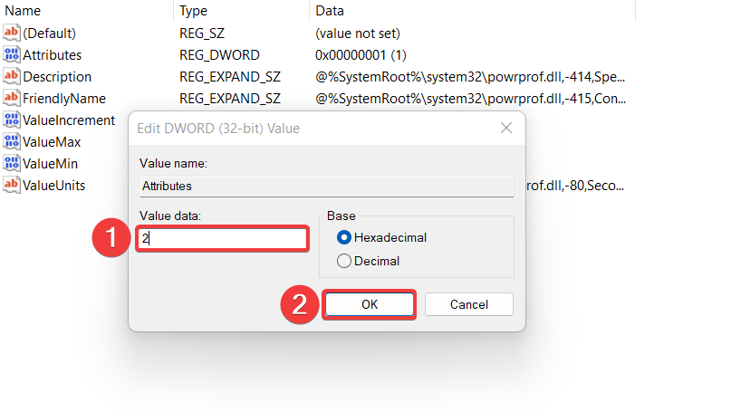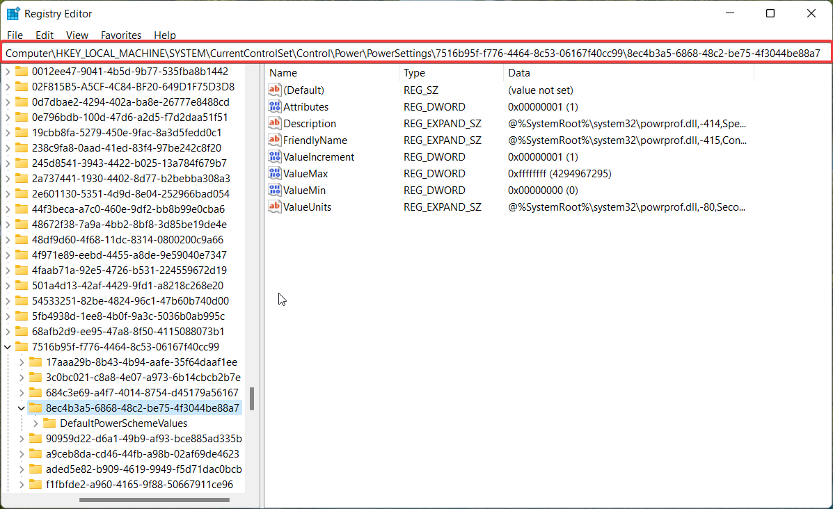 Computer\HKEY_LOCAL_MACHINE\SYSTEM\CurrentControlSet\Control\Power\PowerSettings\7516b95f-f776-4464-8c53-06167f40cc99\8EC4B3A5-6868-48c2-BE75-4F3044BE88A7 - Here, right-click the Attributes key and choose Modify from the context menu.