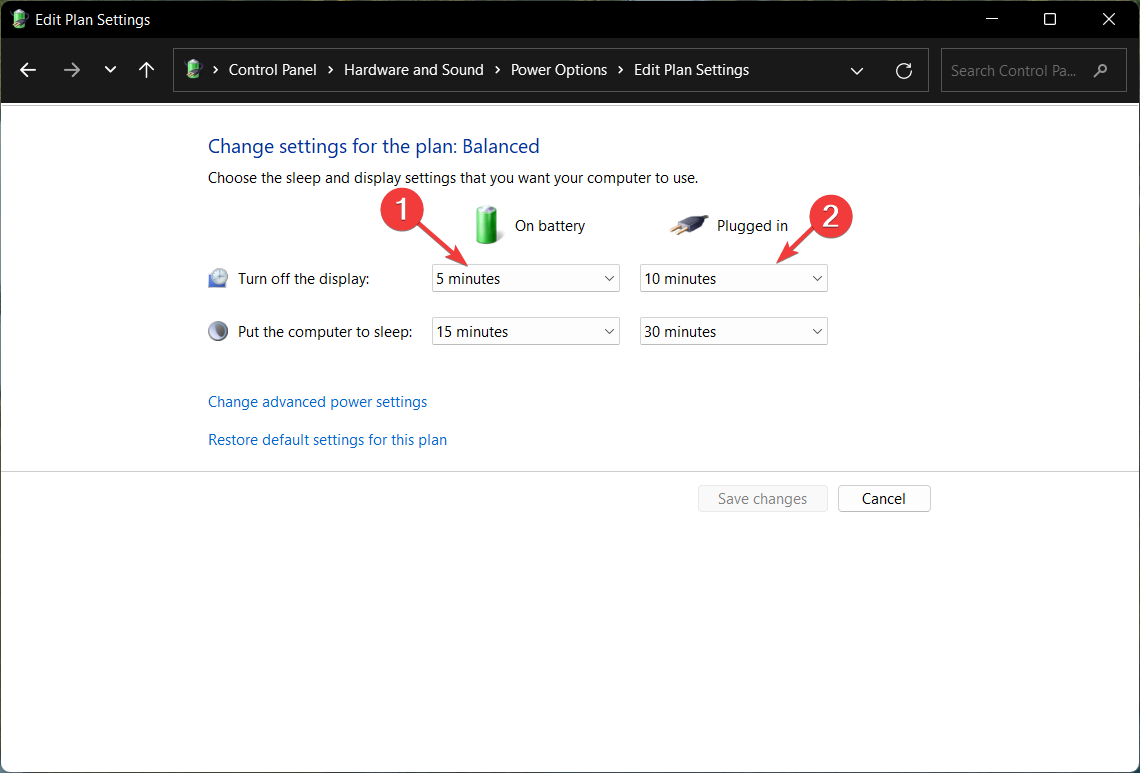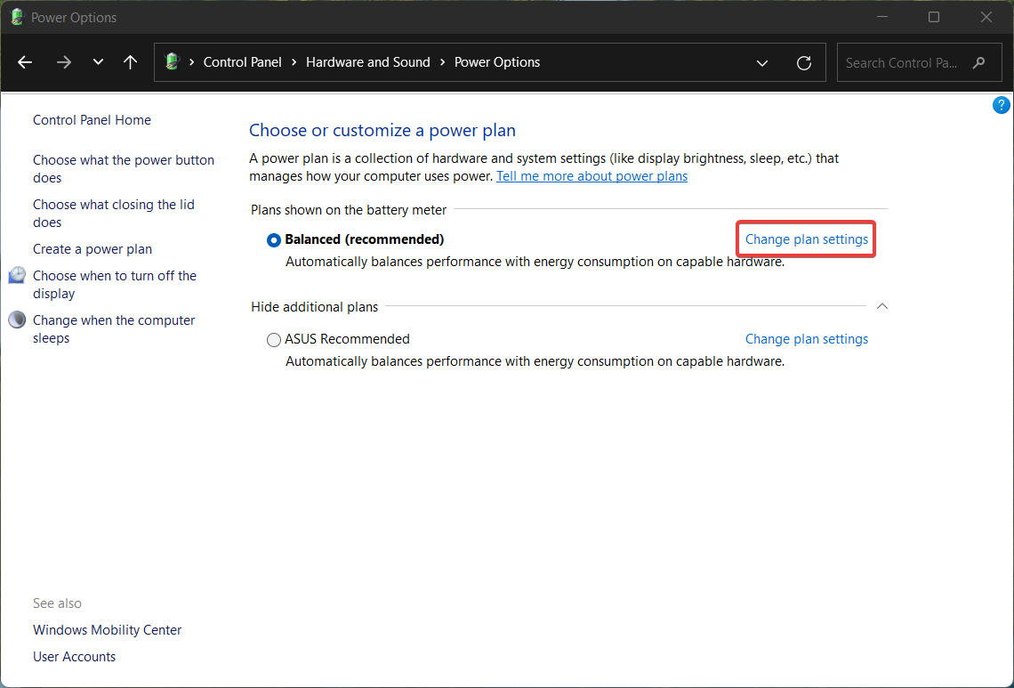 - From the Choose or customize a power plan window, click the Change plan settings option for the current power plan.
