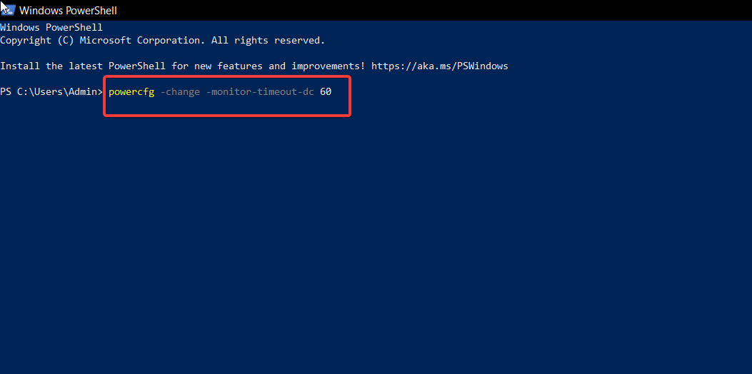 powercfg -change -monitor-timeout-ac 60 - To change the screen timeout duration when the computer is powered by a battery, execute the following command. Here, again replace duration with the time duration in seconds.