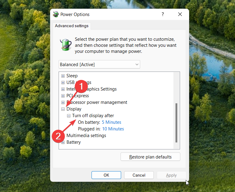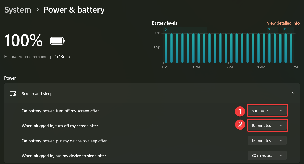 - Assign the time duration for the Turn off the display option for both On battery and Plugged in scenarios.