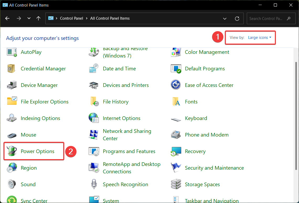 - Launch Control Panel once again, select Large icons in View by dropdown, and select Power Options.