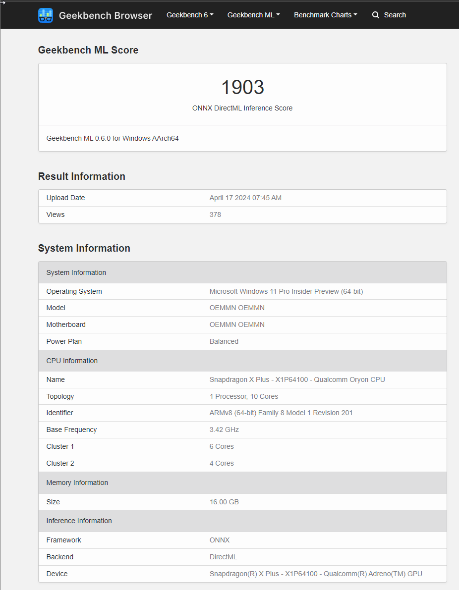 According to the specifications under Interference information, the device can perform machine learning interface tasks. It has the ONNX framework, DirectML as the backend for hardware acceleration, and Qualcomm Adreno GPU integrated into the Snapdragon X Plus processor; all of these make this device suitable for carrying out AI-related applications and tasks without any problems.