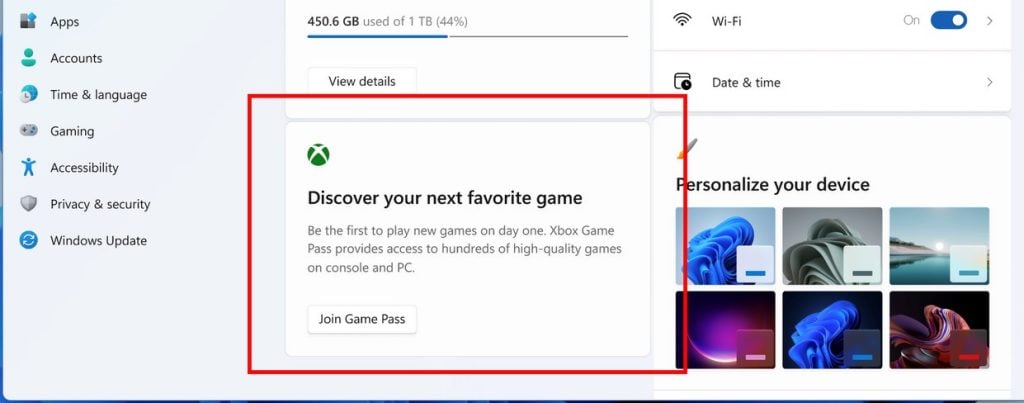 You can find this card on the Settings app homepage, and it will appear to you only if actively play games on your PC. We still don’t know exactly how this feature will work, but currently, it works as an ad for Game Pass.