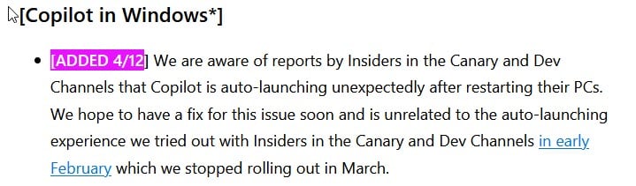 I think this should be added as a known issue to the Beta 22635.3495 blog post as well? This started happening after the update and iirc, no rollout of Copilot auto-launch ever happened for Beta.