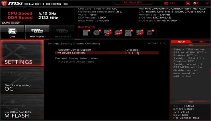 - Go to the Miscellaneous tab. Locate TPM Device Selection and set it to PTT or fTPM