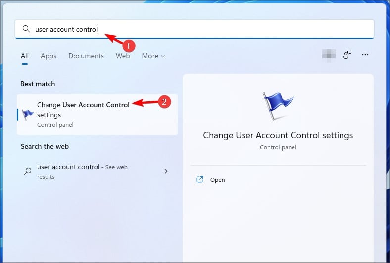 - Click the Search button and enter user account control. Select User Account Control Settings from the results.