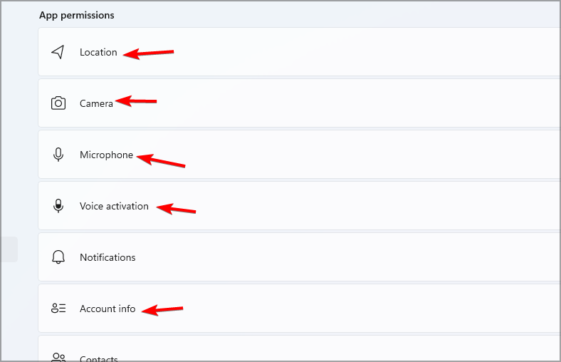 - Now scroll down to App permission settings and disable Location, Camera, Microphone, Voice activation, Call history, and Account info settings.