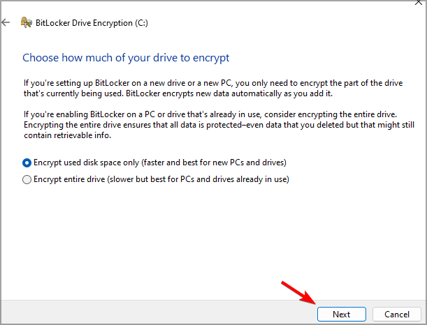 - Select how much of your drive you want to encrypt.