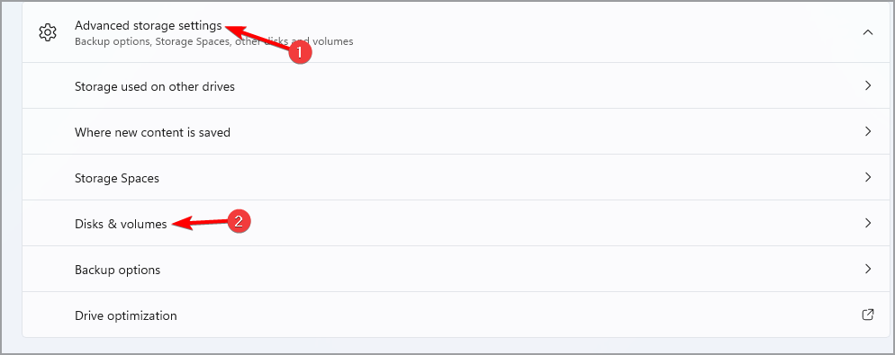 - Expand the Advanced storage settings section and click on Disks & volumes.
