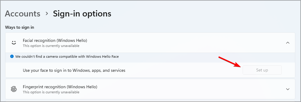 - Select Facial recognition or Fingerprint recognition and click on Set up.