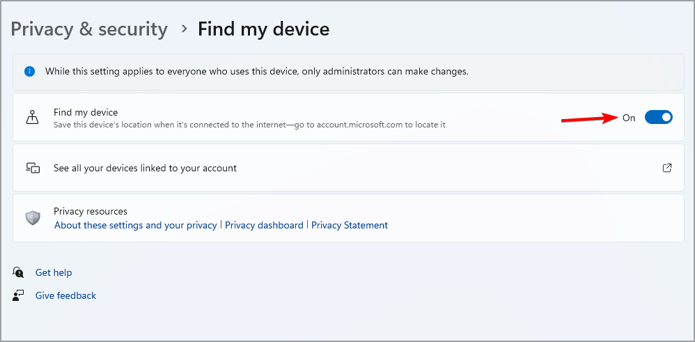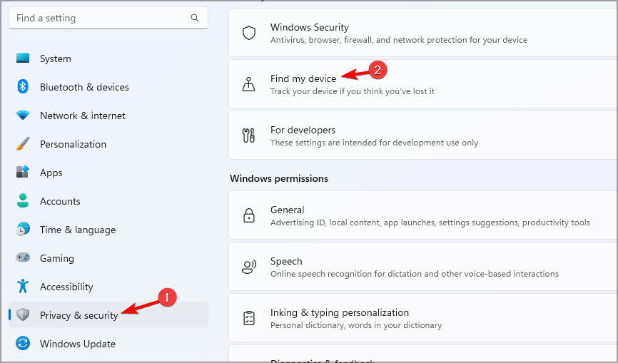 - Go to Privacy & Security and select Find my device.