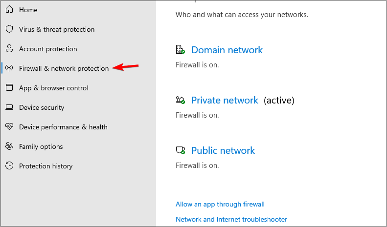 - Select Firewall & network protection and make sure that firewall is enabled for all types of connections.