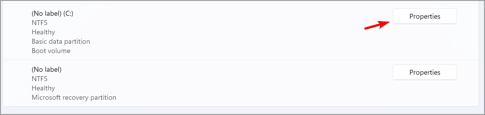 - Select the partition you want to encrypt and click on Properties.
