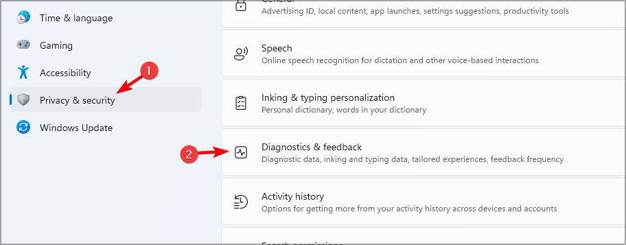 - Go to Privacy & security and select Diagnostics & feedback.