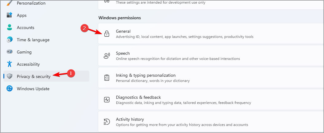 - Go to Privacy & security and then select General.