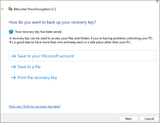 - Choose how you want to save your recovery key.