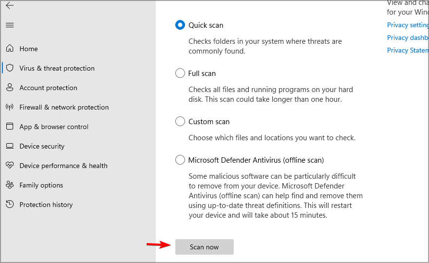 - Select the type of scan that you want and click on Scan now.