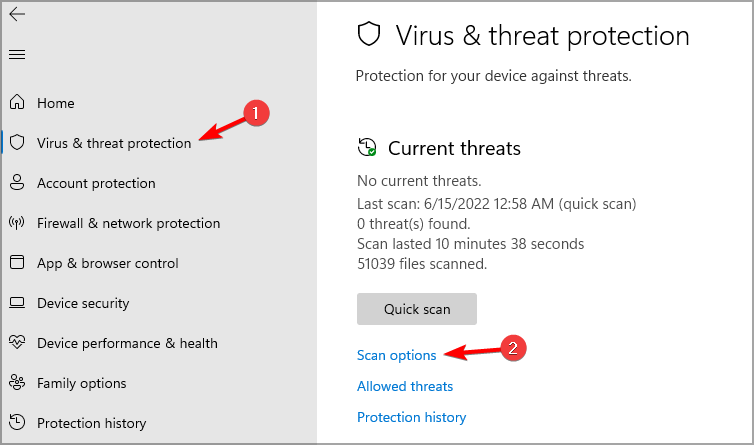 - Go to the Virus & threat protection and click on Scan options.