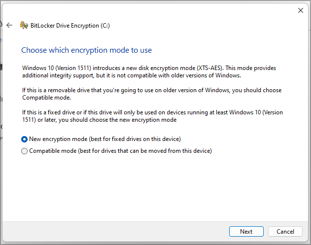 - Select the desired encryption mode.