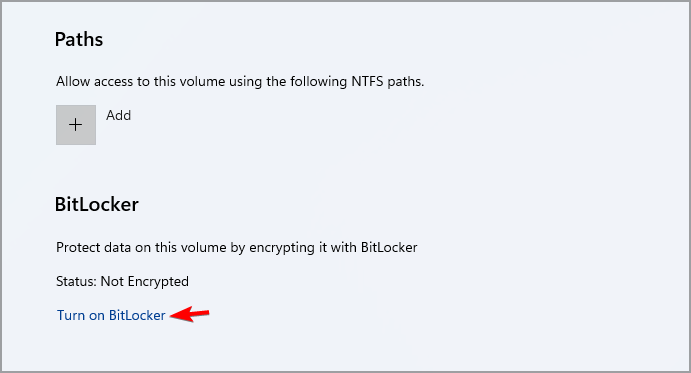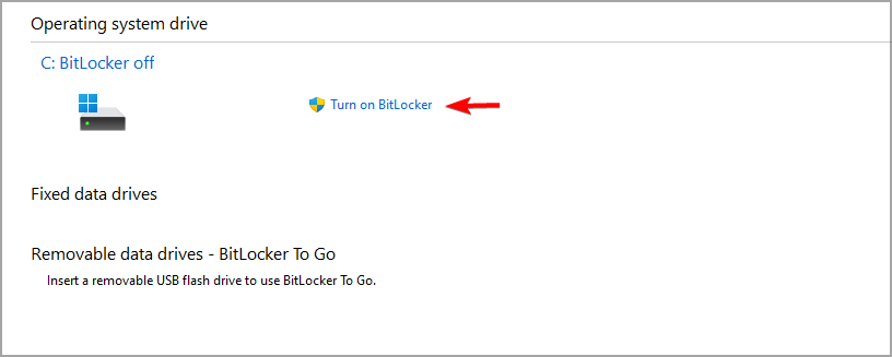 - Click on Turn on BitLocker.