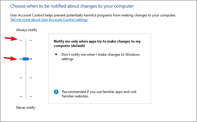 - Make sure that User Account Control is set to a recommended value or the one above.