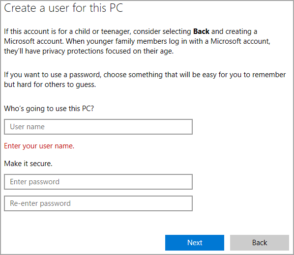 - Enter the username and password for the new account.