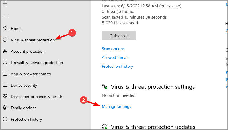 - Select Virus & threat protection and then go to Manage settings.