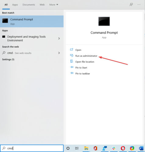 - Search for cmd and click on Run as administrator to open Command Prompt with administrative privileges.