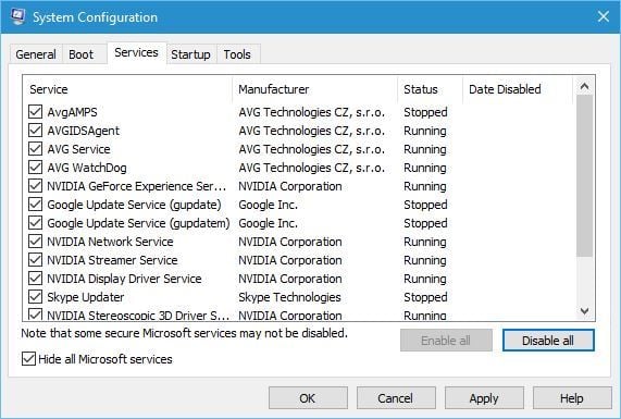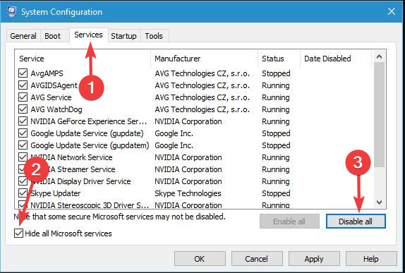- Go to the Services tab, check Hide all Microsoft services, and click the Disable all button.