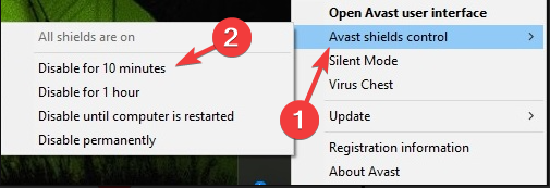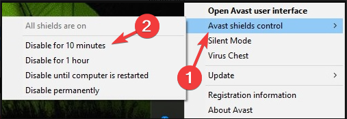 - Click on your antivirus icon, hover over Avast shields Control and select Disable for 10 minutes (This step varies for different antivirus software).