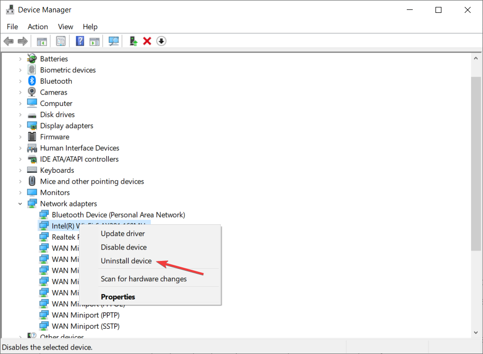 - Locate your wireless device, right-click it, and choose Uninstall device.