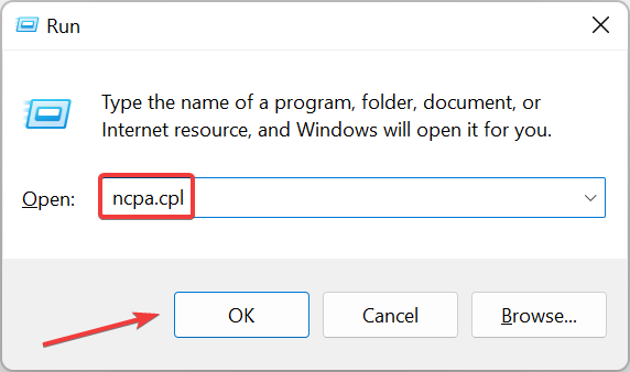 - Press Windows + R to open the Run command, enter ncpa.cpl in the text field, and hit Enter.