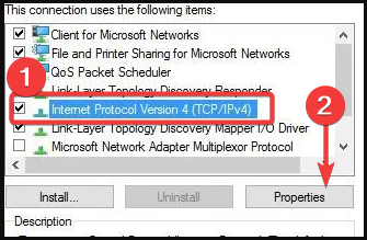 - Select Internet Protocol Version 4 (TCP/IPv4) and click the Properties button.