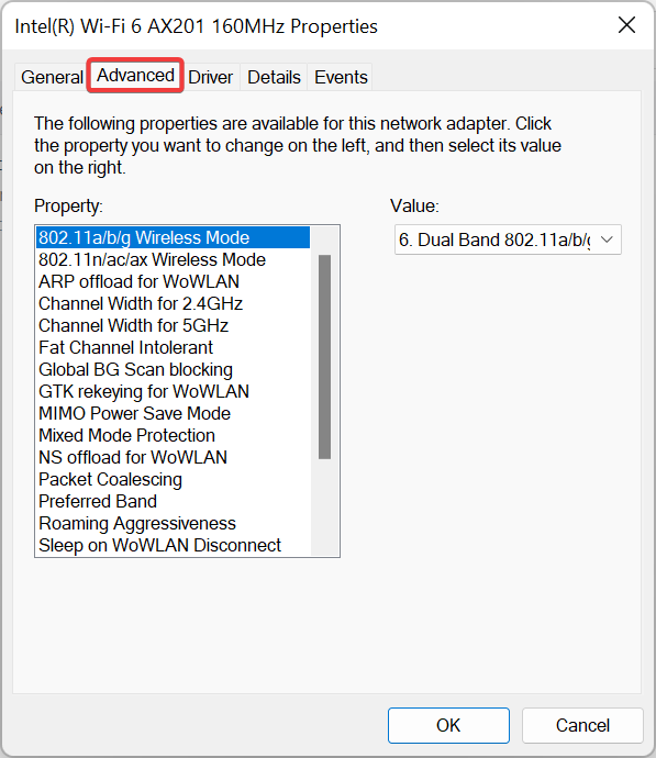 - Go to the Advanced tab, locate 802.11n Channel Width for band 2.4, and set it to Auto.
