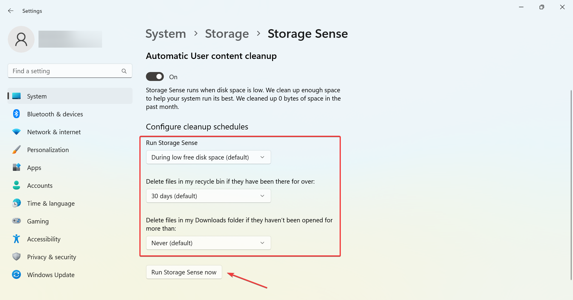 - Now, configure the feature settings and cleaning frequency. Also, you could click on the Run Storage Sense now button at the bottom to launch a scan right away.