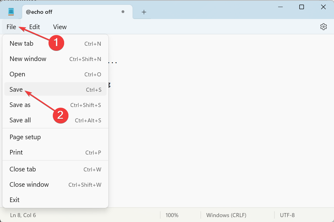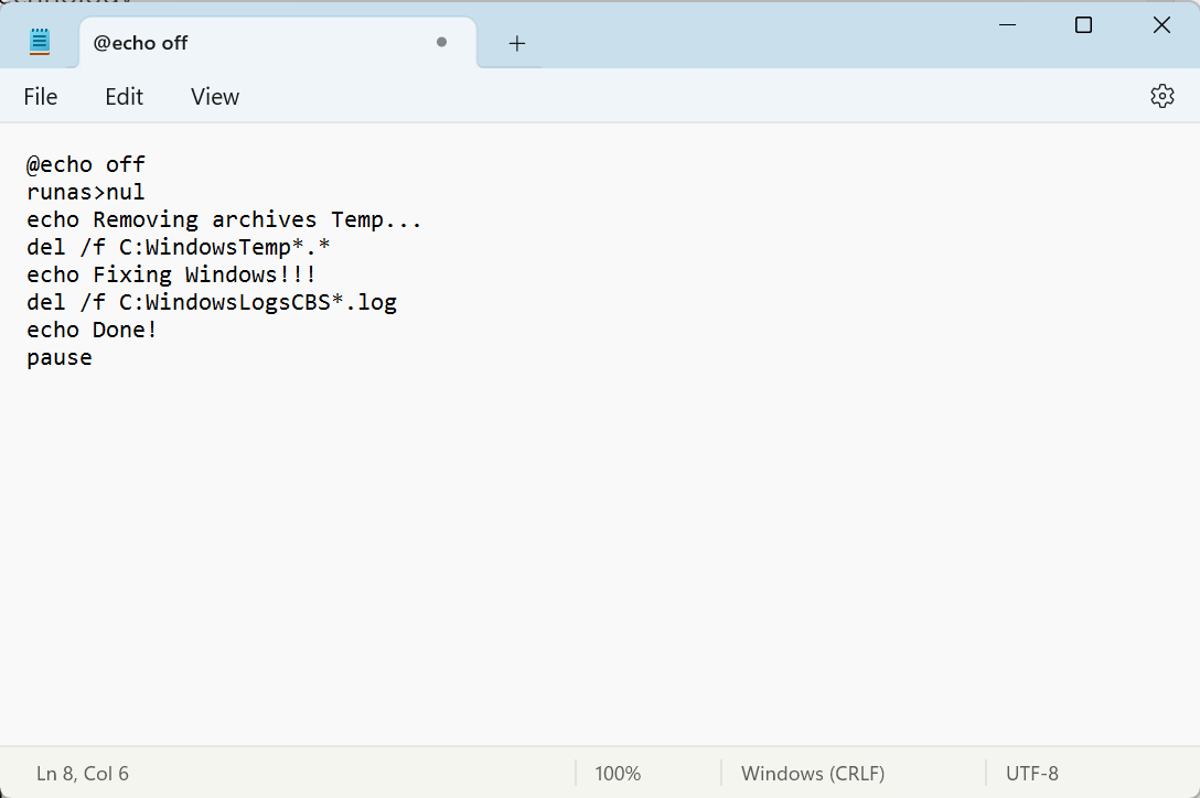 @echo offrunas>nulecho Removing archives Temp...del /f C:WindowsTemp*.*echo Fixing Windows!!!del /f C:WindowsLogsCBS*.logecho Done!pause - Once done, click on the File menu, and choose Save.