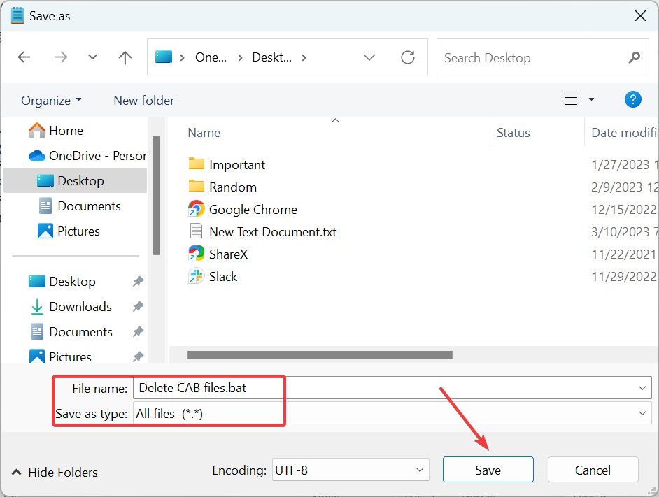 - Navigate to the desired location, enter Delete CAB files.bat as the File name, select All files from the Save as type dropdown menu, and click Save.